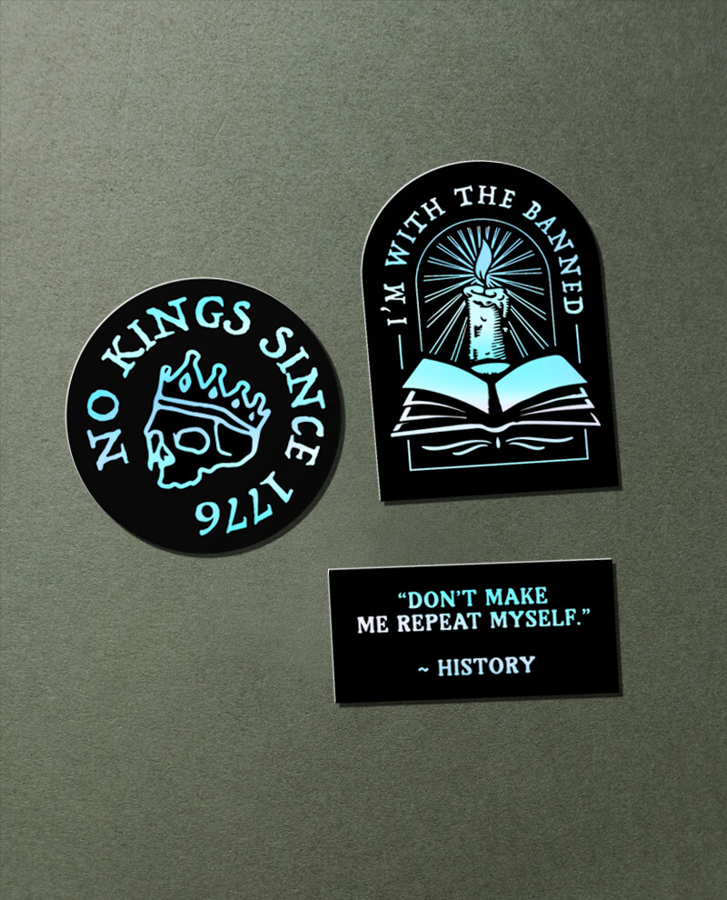 Use your stuff to say enough is enough! This holographic sticker pack takes on MAGA with punchy messaging and striking visuals. Slap them on your water bottle, laptop, or notebook to spark conversation and spread the word.