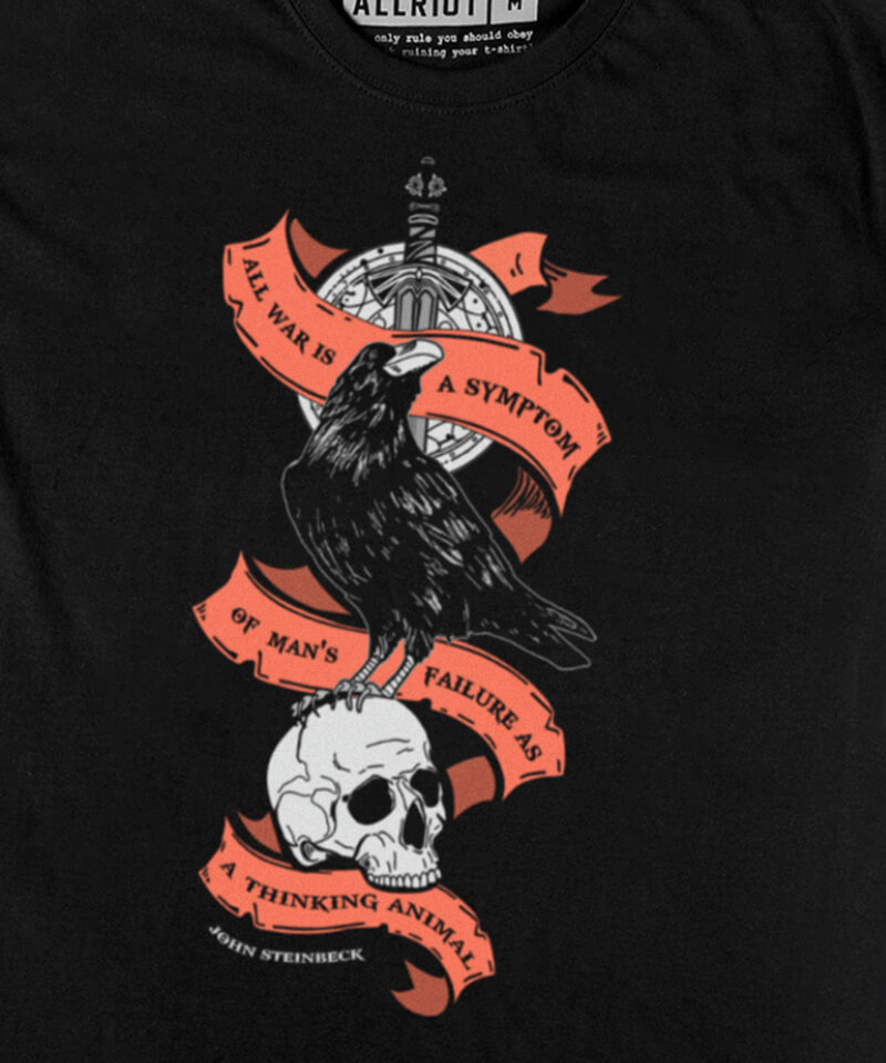 They say that ‘war is old men talking and young men dying’, but talking about the horrors of war just might be the best way to stop it from happening again. Do we sacrifice ourselves for loved ones, love for country, or for the love of profit for a tiny minority of profiteers? That tired song-and-dance routine is a mere swansong in the progress of human history. Our Allriot tee features large front print with quote from the American ‘Giant of Letters’ himself, John Steinbeck, and tells the tale of war throughout the ages in a single slogan: War is Hell.