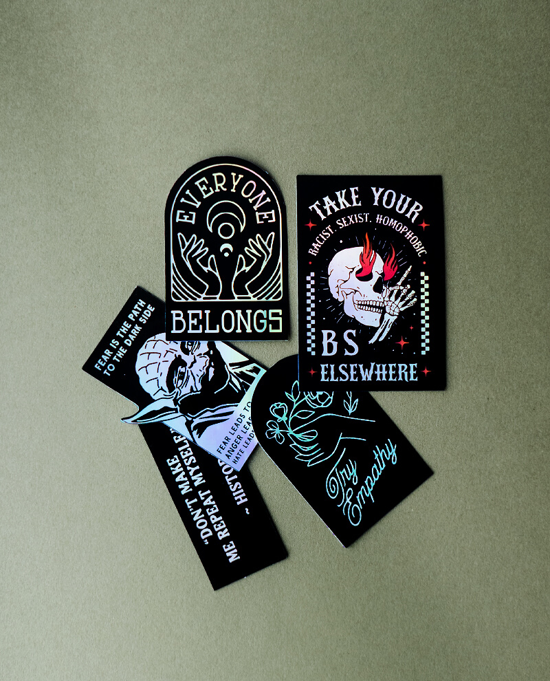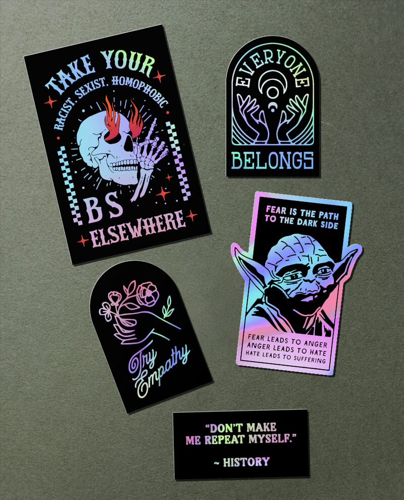 Use your stuff to say enough is enough! This holographic sticker pack takes on hateful political rhetoric with punchy messaging and striking visuals. Slap them on your water bottle, laptop, or notebook to spark conversation and spread the word.
