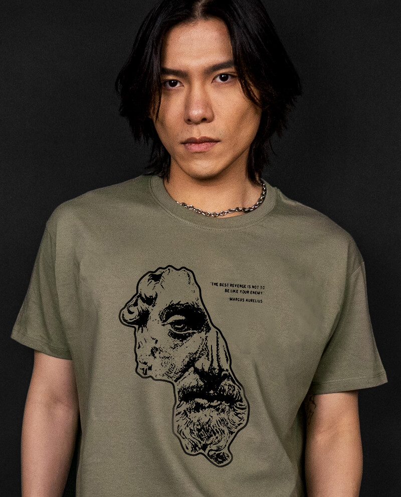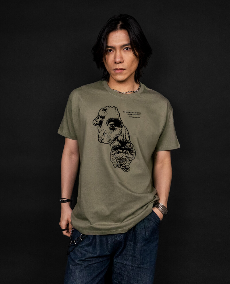 The last of Rome’s ‘Five Good Emperors’, Marcus Aurelius wore his own anecdotes with pride in the face of an armada of challenges. Clashing with a flurry of headwinds at the end of Pax Romana, both from outside and within, Marcus’s astute, stoic approach to governance was rewarded with an irreplaceable title of the ‘philosopher king’, where his rule stood in stark contrast to his successors. This Stoic tee is a universal decree for those fighting the impossible and features front monochromatic print. No matter what life throws at you, face your opponents with unwavering humanity.