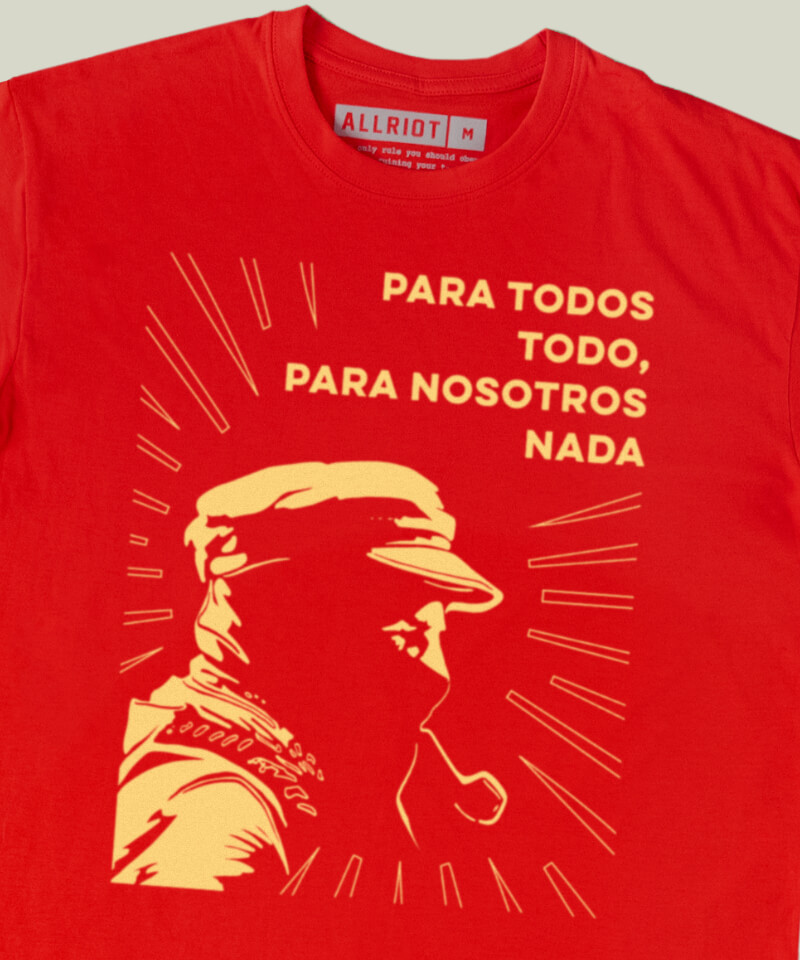 This t-shirt tries to capture the powerful spirit of the Zapatista movement in revolutionary red and gold, complete with their signature, provocative slogan. Suit up. Viva el revolución.
